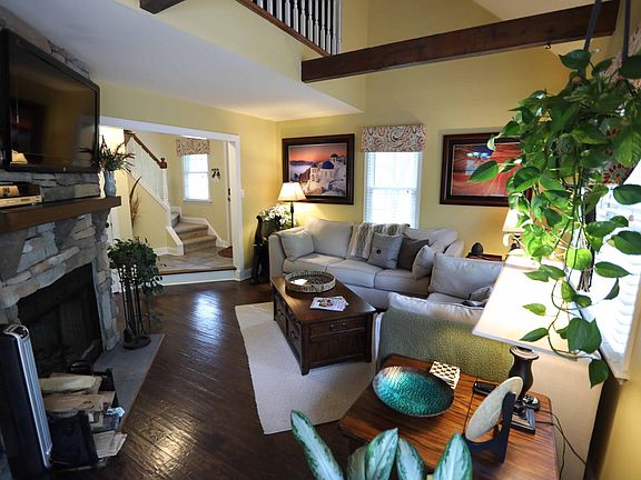 Available for move in 8/1/21 Unfortunately, we can not accept any pets, we had an issue in the past. Move right in to this gorgeous end unit. This home has three full levels of living space. Park in your private driveway and walk into the lower level or park in front of unit and follow the paver walkway to a private side entrance. There is a tiled foyer, and then it is a step down to the spacious living room with newer hardwoods, stone fireplace, two story vaulted and beamed ceiling. You are open to the eat-in area and tidy kitchen- all boasting new hardwoods and updated appliances. There is a slider to the rear deck which is quite private and looks out on a wooded space. There is a first floor bedroom, full bath and a great pantry. Heading upstairs there is a charming loft area overlooking the first floor. There is also a bedroom and another full bath. The bonus is the lower level! Completely redone, a true walkout with a new sliding door, dry bar, built ins for all your video 'stuff', a separate playroom or bedroom, half bath, and the owner has added a full size laundry room. This home is in great condition, has a very private location, and the floor plan works for many different lifestyles. Completely redone in 2014. Virtual showings with Q/A are available upon request. First and last month rent and security deposit due upon signing. Tenants are responsible for electric and water. Landlord will pay trash, recycling, snow removal and lawn service.
