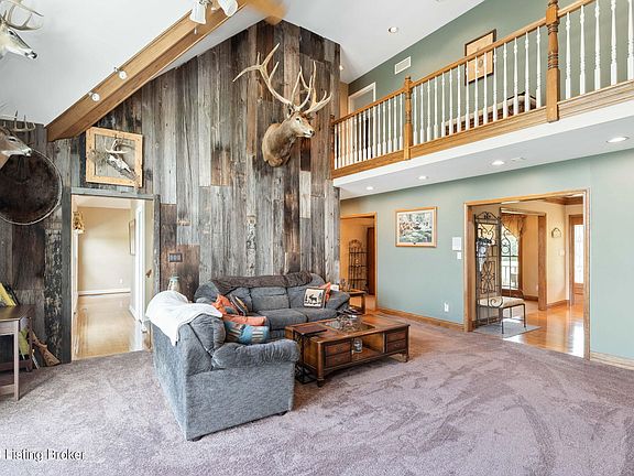 Your sanctuary awaits on sprawling acreage of serene countryside. Situated perfectly on almost 60 acres, this homesite offers a little of everything for the buyer wanting to get away from it all and enjoy peaceful natural surroundings. An equine-lover's paradise, this property has been recently upgraded to include a full livestock fence around the perimeter. The home is a retreat perfect for the weary worker ready to unwind. Custom-built with a finished walkout basement, this amazing home is flooded with natural light and offers exquisite views of the surrounding countryside. Enjoy cool nights next to the fireplace in the vaulted great room. The deck off the great room is the ideal spot for grilling out or relaxing while admiring your estate. The chef of the family will love the eat-in kitchen complete with a full complement of stainless appliances, quartz countertops, prep island with gas cooktop, and ample cabinet storage. The laundry room is conveniently located off the kitchen. The formal dining room is off the kitchen and is the perfect spot for hosting holiday dinners. The relaxing owner's suite features built-in bookshelves with cabinets, and walk-in closet. The spa-like en-suite full bathroom offers a walk-in shower, whirlpool tub, and double vanities with marble countertops. There is an additional bedroom down the hallway that is close to the second full bathroom. The second level is home to two spacious bedrooms, both with built-in window seats, walk-in closets, and separated by a full Jack-n-Jill bathroom. Make your way to the finished walkout lower level complete with family room with fireplace, access to the covered patio, private and secure safe room with added storage, full bathroom, exercise room with hot tub, and plenty of additional storage space with workshop area. Take advantage of outbuildings on the property which include a barn and detached garage with plenty of space for all your outdoor equipment. Located just minutes off I-71, this prime spot affords easy access to Louisville, Cincinnati, or Lexington. Come see what makes this property truly special.