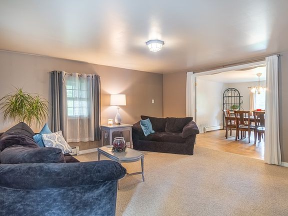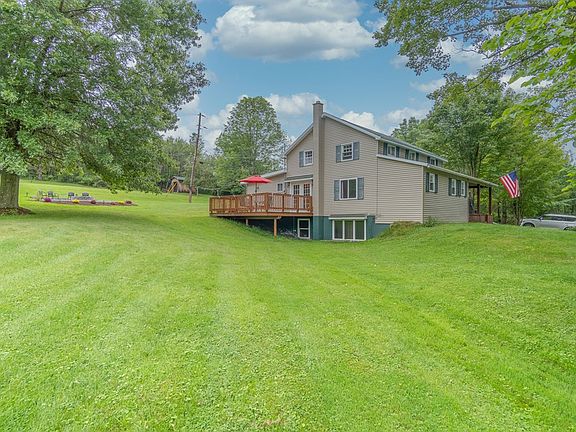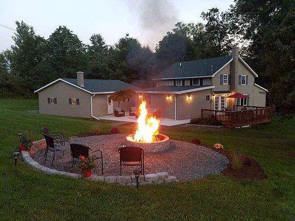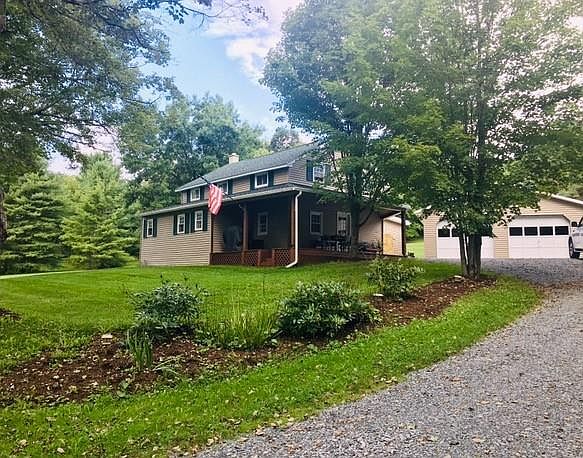 Spacious home situated on a beautiful private 2-acre lot. The first floor has a living room, dining room with french doors, kitchen with gorgeous wood vaulted ceiling, a bedroom, and bath. Double doors lead out to the deck. There is also a covered porch at the front and a patio outback. There are 3 bedrooms upstairs with the smallest one currently being used as an office and a full bath. The basement has radiant heat floors in the family room and workout room. A new roof was just installed on house. New firepit area, perfect for the crisp fall evenings. Two-car detached garage with wood stove and workshop area. Shed for extra storage. With plenty of space for the whole family, it's the perfect place to call home!