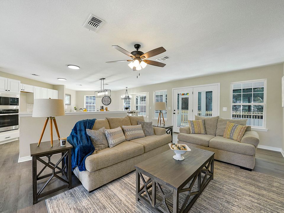 Come see this stunning 3BR/2BA home nestled on a nearly 1/2 acre corner lot in highly coveted Golf Course Estates! Boasting modern finishes throughout, this home has been upgraded with floor to ceiling paint, updated kitchen and baths, LVP flooring, and new lighting, just to name a few! With 1976SF, this beautiful home offers an abundance of room for your family, friends, and guests. With a split floor plan and open concept, this home lives BIG! You will enjoy evenings sitting on your 276 SF screened-in patio, or grilling on the new deck surrounded by mature trees. The trees extend along the back and one side of the property, offering extended privacy and a barrier to noise. Extensive exterior landscaping and drain work, as well as construction of a retaining wall were just completed for the new Buyer to enjoy without all of the hassles! And, with the new expansion project along P.J. Adams/Antioch, you will be able to zip to military bases, shopping, and beaches in record time. You don't want to miss this great home! *ROOF 2019, HVAC 2018, WATER HEATER 2021.*