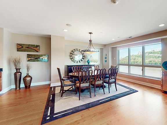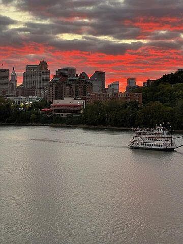 Panoramic view of Cincinnati Skyline, Ohio River, Mt. Adams, and overlooks Harbor Greene pool! Recently updated! New flooring 7/22, HVAC 1/21, Ice-maker 11/23, and freshly painted 12/22! Spacious 2799 sq ft interior, Custom walk-in closets, 500 sq ft balconies! Closest inside parking spots B3 & B4. Gas line run for future fireplace. Have agent print full features in MLS misc. docs