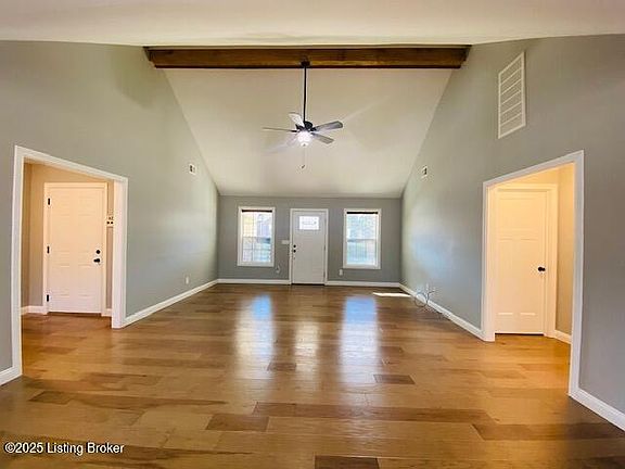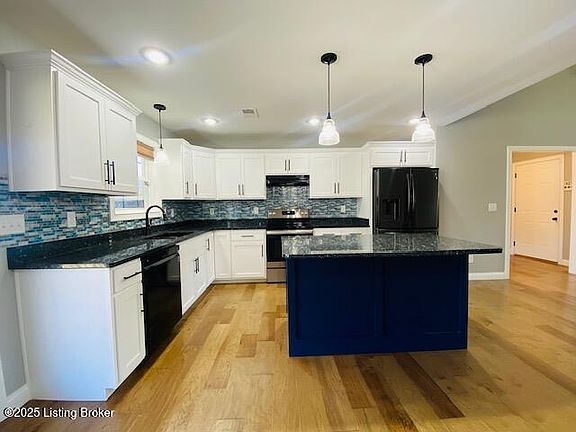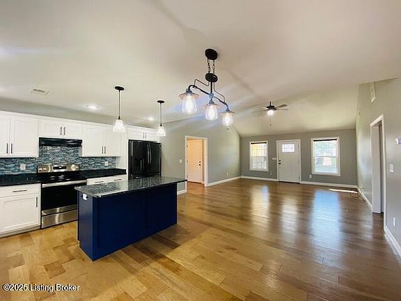 Delightful three bedroom two bath brick & stone ranch style home with two car attached side entry garage conveniently located in Heritage Park Subdivision. Home offers a spacious open floor plan, smooth ceilings & vaulted Living Room with lovely, engineered hardwood floors. Eat in Kitchen features nice white cabinetry, granite countertops & great island bar. Desirable split floor plan allows for privacy with the Primary Bedroom suite offering decorative double trey ceiling & tiled Bath with double sink vanity & walk in closet. Two additional carpeted bedrooms are housed on the opposite side of the home. Kick back & relax on the great covered rear deck for all your outdoor enjoyment. Located near all the amenities of historic Bardstown & great commute location via 31E or Hwy 245.
