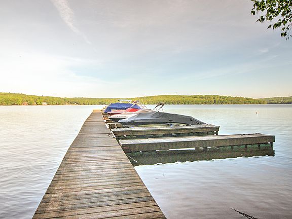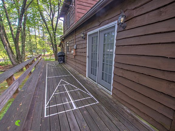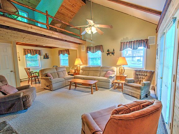 Lake Wallenpaupack renovated Gumble chalet within walking distance to your deeded Boat Slip! This 2 bedroom, 1.5 bath home features an updated kitchen, spacious living room w/cathedral ceilings, pine T&G & wood stone fireplace, master on 1st and a full updated bathroom. Roof raised 12' to create a very large sleeping loft (2nd bedroom) with a half-bath (can be converted to 3 bedroom). New French doors & new Pella double hung windows, HW floors under carpet & screened/covered porch. Home sleeps 9 comfortably. Septic upgraded in 2013. Comes mostly furnished.