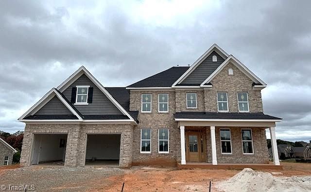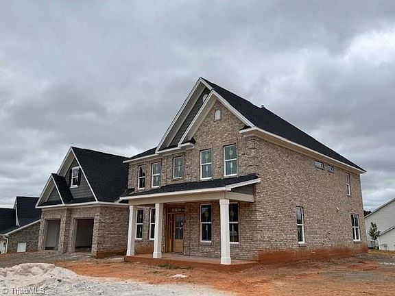 Under Construction - Gentry Farm lot #42! All brick home in King built by Arden Homes. The Roller Mill plan has an awesome open floor plan that offers over 2,200 sqft on the main level with 2 bedrooms and 2 full baths Exterior brick in "French Manor" with dark gray, black, and white vinyl accents, and stained wood front door with double sidelights. The large 2-story great room with gas fireplace adjoins back patio. Bright kitchen features island, with white painted upper cabinets, and stained lower cabinets in "Shale Gray" with Cosmo Carrara quartz counters, black hardware, gray picket tile backsplash, and Frigidaire Gallery Series stainless appliances. Upgrades on this home include a coffered ceiling and wainscoting in dining room, laundry sink with cabinets, dry bar/butlers pantry, and drop zone. Engineered wood floors in "Sawgrass Oak" thru most of the main level including the primary bedroom and closet, with black door hardware. {ROLLER MILL PLAN - Elevation B}