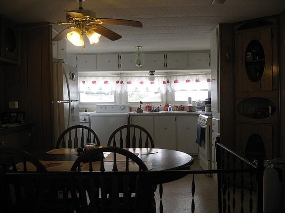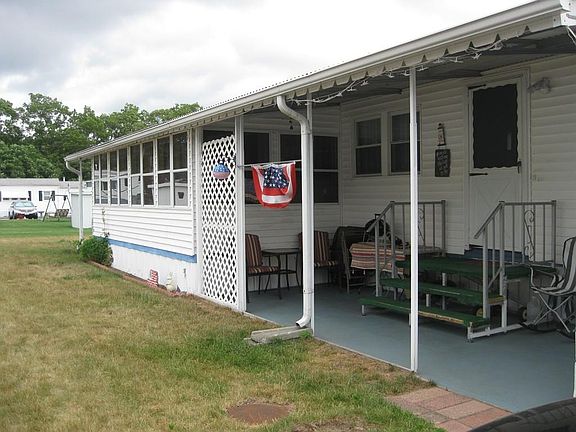 This home is MOVE IN READY! Many improvements have been done including a new hot water tank in 2015, full under building insulation in 2015 by an energy audit company, roof, windows and furnace in 2004. This home features an open living room/kitchen floor plan for that much desired open and spacious feel. Living room has a laminate floor and features a decorative fireplace and chimney for ambiance. The master bedroom is a spacious 13'6"x11' with a double closet and a second smaller bedroom. Enjoy the 3 season porch or possibly convert it to a year round bonus room (19'3"x8) and add to your year round living area. Situated on one of the larger lots in the park, but still have the same park rent fee of $400 which includes your taxes, water, septic system and trash, street snow removal and common area landscape. Owner responsible for cutting their grass, shoveling driveway, in front of mailbox, and steps.