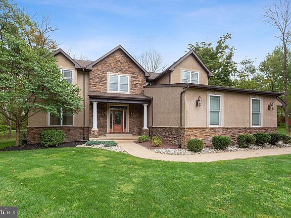 Tucked in an enclave of trees in the highly-respected Central Bucks School District, this remarkable custom home on 2.12 acres is located on a quiet two-home cul-de-sac. The drystone front, interesting roof lines, classic large front porch columns and incredible entry door with sidelites and transom speak to the thoughtful planning and quality workmanship that occurred during the design and construction of this home. The living room, dining room and sunroom have attractive mahogany 5" plank hardwood flooring and crown molding. Picture-frame molding can be found on the walls of the living and dining rooms. The gourmet kitchen and adjacent family room will prove to be the popular gathering spot. Special features of the kitchen include a new beverage cooler, 2 sinks, high-end appliances including a subzero refrigerator, gas cooking, clever recessed coffee maker, trendy tile backsplash and practical built-in desk. The two-level island has room for 5+ stools. There are many, many cabinets and bookshelves and ample counter workspace which is ideal for serving during those large-group gatherings. The built-in buffet with glass doors provides even more cabinet space. The stone fireplace with raised hearth is the focal point of the family room and the many windows with chic window treatments allow a lot of natural light. The sunroom, with floor-to-ceiling windows,and the breakfast room both have doors leading to the 42X12'stamped concrete patio. Attractive estate fencing surrounds the immediate backyard, which is perfect to keep children or pets close to home. Striking ornamental metal stair balusters grace the stairway to the 2nd floor. The spacious master bedroom suite has two closets, one of which is a large walk-in, and a sophisticated master bath with beautiful heated tile shower, free-standing oval tub, radiant-heated floor and towel rack warmer. Four other bedrooms, a reading/computer bonus area, and two hall baths complete this second floor. The main-floor study has a separate door, making this an ideal home office or possibly could be used for an in-home occupation; check with the township for allowable uses. The incredible open finished basement currently is being used as a second family room and there is also an attractive bar area with sink and a convenient powder room. An separate finished room in the basement near the bottom of the stairs would make a perfect exercise room, play area or hobby station and there is even one more out-of-the-way space for wine-making, trophy display, sports equipment storage or for some other practical use. The entire finished basement is flex space and can be used in so many ways. Don't miss the efficient dog washing area by the washer and dryer! Although seemingly a private homesite, this property is actually within walking distance of Central Bucks South and within minutes of Routes 611 and 202. This exceptional home is a pleasure to show. ***All room measurements are approximate.***