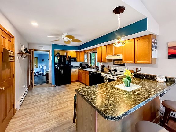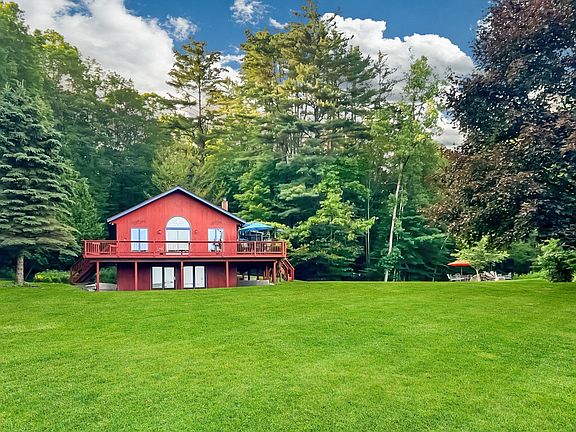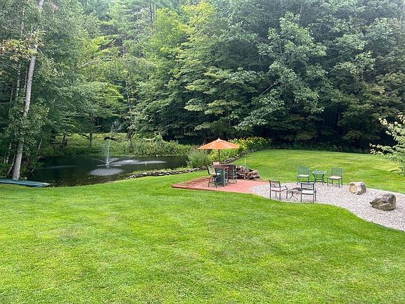 Enjoy the morning mist rise from the river below, evening sun & rainbows from the large windows. A spacious yet cozy home, with a 4-season sunroom for your first cup of coffee. 4 bedroom spaces; primary suite on the main floor, 3 more on lower floor. Open first floor to enjoy the views of the pond from the kitchen or the front lawn from the large living room. Both living room & dining room are on the main floor. Lower level includes a comfortable family room with double walk out French doors, as well as, a Vermont Casting wood stove. Radiant heat in the floor of the lower level & on the stone tile front entrance room. Great office space to work at home with high-speed internet. You can watch the wildlife that graze in the grass from the large windows. Attached 2 car 25x26 garage with built in work benches along with large walk-up attic above for plenty of storage. Now to the outside where you can have large gatherings if you like; several out buildings to store all your toys with a working woodstove in the large building, plenty of room to park your RV or boat & also store your firewood all behind a privacy fence away from the main home. A pond with fountain, firepit with patio seating included, several flower gardens, beautiful large lawn, deck & more. Close access to the VAST trail for enjoying snowmobiling right from your backyard. Very peaceful location, but 5 minutes to the VA