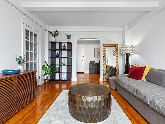 This spectacular one-bedroom coop boasts a generous 980 square feet of living space, laid out as a corner unit above the tree line with great privacy, making it a truly remarkable find. As you step into this recently renovated, beautifully maintained unit, you'll be greeted by an abundance of natural light, pouring in from the southern and eastern exposures. The gleaming hardwood floors and vaulted ceilings create a warm and inviting atmosphere in this spacious living area. The unit's excellent condition means you can move right in and start enjoying all the comforts of home immediately.