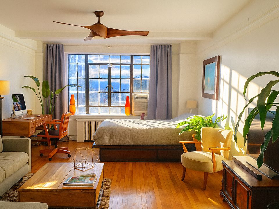 Sun-drenched apartment with penthouse views, featuring a large casement window (western exposure), a renovated kitchen and bathroom, Wolf induction stovetop, Caesarstone quartz countertop, convection microwave oven, Fisher & Paykel dishwasher, hardwood floors throughout, a walk-in closet, and high vaulted ceilings. Living room and kitchen fit out with smart LED light strips.