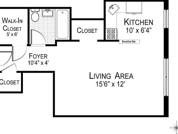 - Recently renovated studio apartment with a bathroom, two large closets, an office nook, and a separate kitchen with a dishwasher