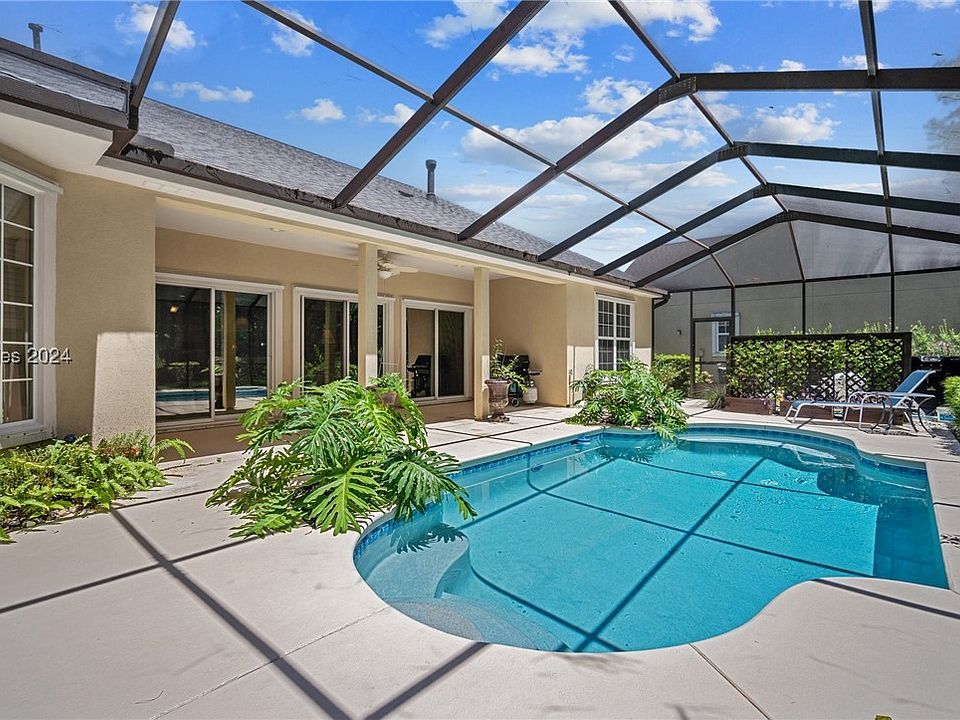 Sycamore Model with 3 Bedrooms, 3.5 Baths, Den and Heated Private Pool! Beautiful home featuring a great room, overlooking the screened lanai with a heated pool and serene views of the private woods, creating a peaceful and quiet atmosphere. The gourmet kitchen boasts stainless steel appliances, double ovens, a large island, and 3 double glass sliding doors leading to your private outdoor oasis. Natural gas fireplace & new roof in 2023. This property is in the active 55+ community of Sun City, offering a resort-style experience with guard-gated entry and MANY amenities. Please ask for the full list of upgrades! Too many to list here!