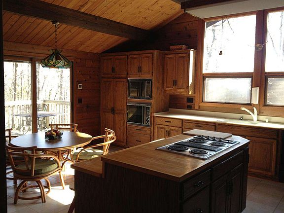 Private waterfront retreat with a mountain feel. Almost 2 acres of hardwoods but with unobstructed views of the water. Soaring contemporary with tongue and groove walls and ceilings, hardwood flooring, multiple fireplaces, ceramic tile and new carpet. Open floor plan great for entertaining, huge kitchen with views of the lake. Wall of windows in the living room overlooking the lake. Master on the main floor with jetted tub and heat lamps, large laundry on main that has bunk beds and can be used as forth bedroom. Two large bedrooms and one bath downstairs as well as large rec room and second living area. Workroom and two storage areas downstairs as well. Walk out to the patio and the concrete golf cart path down to the aluminum covered slip dock floating on very deep year round water. Never out of water. On main channel of the lake. Lot next door was added to this property and was approved for a dock also. Must double check type/size with ranger.