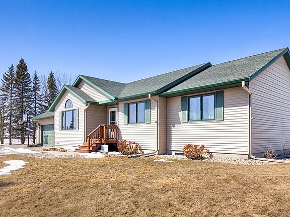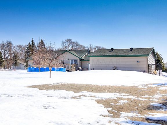 Small town living just 30 minutes from Fargo! Huge 1+ acre corner lot on the edge of town with a great yard and lots of mature trees!! This 4 bedroom, 3 bathroom rambler was built in 2002 and features steel siding, vaulted ceilings, gas fireplace, main floor master suite, and main floor laundry! Finished basement features a huge living/entertainment area that's wired for surround sound, a large 4th bedroom, and a 3rd bathroom (partially finished). Large wood deck, stamped concrete patio, above ground pool, central air, and 5 garage stalls! Both attached and detached garages are insulated and heated! Properties like this one don't come up very often! Don't miss your opportunity to own this one! Call today to schedule your showing!