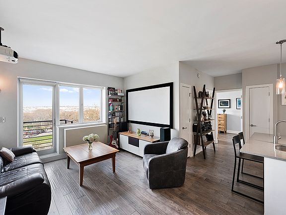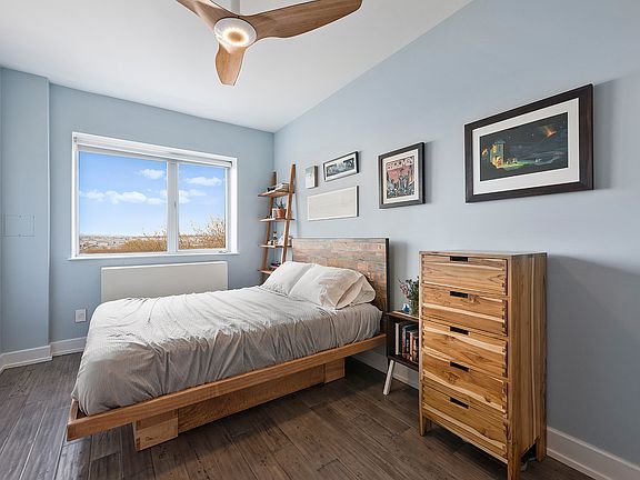 Spacious two-bedroom penthouse with a terrace overlooking Cooper Park. High ceiling and large windows with open eastern exposures gives this apartment lots of light and unobstructed views. Amazing views in this incredible full amenity building. The apartment has been completely updated by the current owner for all modern day living essentials: an Epson TV projector in the living room with a static mounted 92-inch screen with Definitive surround sound speakers; new radiators and AC in all three rooms all wired to the NEST; new hand scrapped birch wood floors; electric solar shades; and custom lighting and ceiling fans. The eat-in kitchen features a new Bertazzoni gas range with matching microwave, new Liebherr refrigerator, Bosch dishwasher with Ceasarstone counter and island, and marble backsplash. The guest bath located off the kitchen has a deep soaking tub, new vanity and Toto duel flush toilet. The master bedroom features a double closet, and en-suite full bathroom with free standing shower. There's also a washer/dryer hookup in the apartment and the unit comes with private storage. This pet friendly building features a full-time doorman, gym, laundry room, swimming pool, sauna, hot tub, dog spa, media room with billiards, common roof top and beautiful backyard outdoor garden with grills! Private parking, rooftop cabanas and storage all available. Enjoy this location across the street from Cooper Park, which has a running track, kids playground, dog run, handball, basketball and skate park. Just three blocks to the subway and minutes to Manhattan. Buyer's broker.