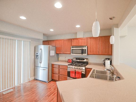 End unit condo being sold fully furnished! The first floor is an open floor plan: kitchen with a bar overlooking the living room and dining area. Kitchen features solid surface counters and S/S appliances...gas range, french door refrigerator, dishwasher and microwave. There is also a large pantry for storage. The carpet has recently been replaced and the bathrooms have tile floors that are