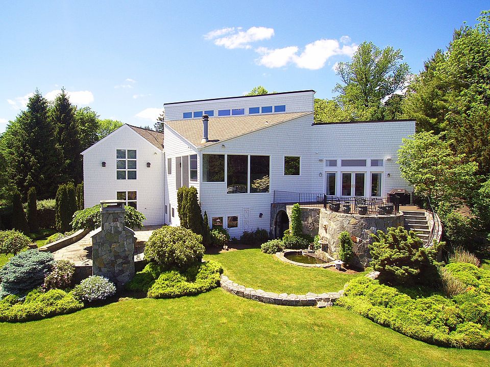 SOUND VIEW ON MILL HILL - Enjoy sweeping views of Long Island Sound from the highest point in Southport; atop Mill Hill. Recently renovated, this 4 Bedroom, 3 Full and 2 Half Bath, bright, sun-filled home features Family Room with Fireplace opening onto stunning circular Deck, Chef's Kitchen and Dining Room overlooking dramatic Living Room with Fireplace and Walls of Glass, Double Office separated by a Sliding Pocket Door, a glorious Terrace Level, a charming Carriage House Apartment and 3-Car Garage. The exceptional 1.27 Acre Property, professionally designed and landscaped by Oliver Nursery, boasts a serene Koi Pond with Fountain. Within walking distance of Southport Village and Metro North Train Service to New York City, this is truly a special residence with a wonderful location. PLEASE SEE ADDENDUM FOR FULL ROOM DESCRIPTIONS