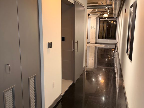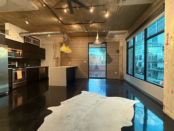 This condominium offers an open floorpan with over 10 fit. high concrete ceilings. It's been been meticulously cared for and updated with epoxy floors, an updated kitchen with plenty of cabinet & counter space, stainless steel appliances, a gas range rarely used ;), electric blinds, tinted windows, updated lighting throughout,a feature wall in the bedroom and custom closet to help you look organized, an updated bathroom with gray tiled walls and a black metal vanity perfect for this industrial vibe.