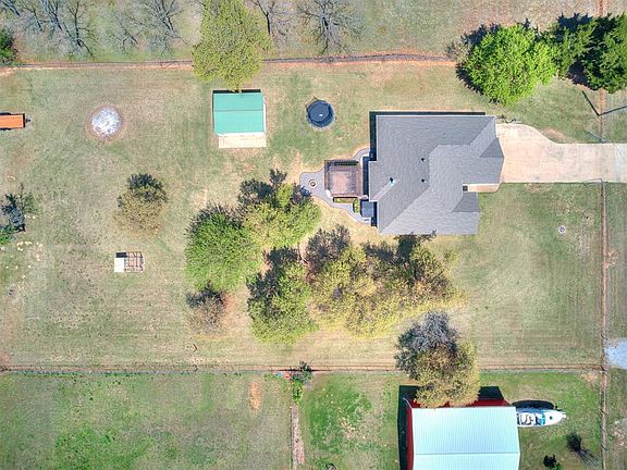 WOW SPLIT floor plan. 4-bedroom, 2-bath, bonus room, 3-car garage, storm shelter, 2023 roof/gutters, approximately 20x24 outbuilding on concrete slab all sits on a 1.15-acre lot in a neighborhood with NO HOA. Inside, you'll find an open family room, fireplace, wood type floors. Kitchen has newer appliances, refrigerator, built in oven, cooktop, microwave, dishwasher. Main side we have a large primary bedroom, walk around closet, double sinks, tub, separate potty room and another large bedroom. Other side is two bedrooms, built-in desk and a bathroom. Step outside to enjoy the expansive backyard, Seller is leaving the hot tub that sits on the patio complete with a charming pergola for outdoor lounging, fire pit, a large metal building Ideal for storage, a workshop, or your favorite hobbies. The property is perfect for keeping animals or creating your own private retreat. (HOT TUB AND REFRIGERATOR ARE SOLD AS IS.)