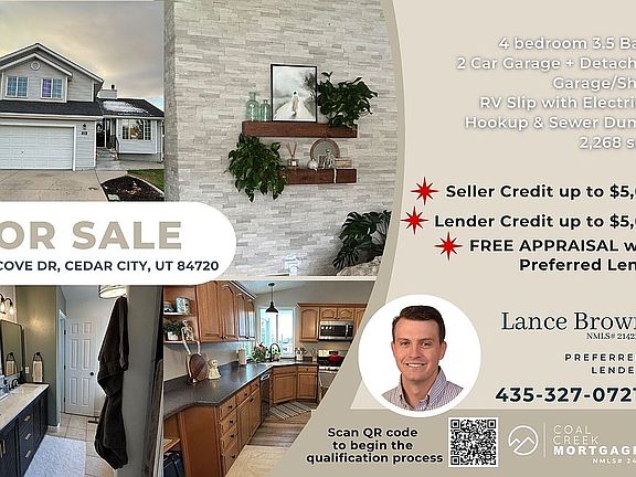 Seller Credit up to $5,000 & Lender Credit up to $5,000. FREE APPRAISAL with preferred lender. Located in the Cove. Perfect location to get anywhere in Cedar quickly. 4 bedrooms. 3.5 bath home. 2 car garage. Large front driveway. Easily fit 3-4 cars. New entry room rock wall is stunning. Wood Burning Fireplace. New light fixtures, paint & carpet throughout. Basement bedroom has an on suite. Amazing detached shop in the back. Garden planter boxes, storage shed. Mature trees. A covered patio that makes summer meals a dream. In ground fire pit for those chilly nights. There is an existing chicken coop that could be put into use. RV parking slip in the front with electrical and sewer dump. New roof put on May 2020. Move in ready. Great neighbors. .25 acres. No HOA. Close to Cedar City Temple with a view of the Temple from front and back yard.