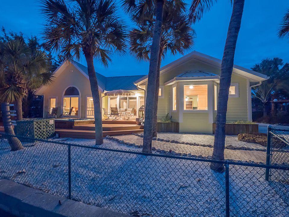 This PRIVATE WATERFRONT TROPICAL OASIS can be your own personal paradise w/a huge PRIVATE POOL, TIKI BAR, HOT TUB, SCREENED-IN LANAI & BONFIRE PIT ALL FOR YOUR PRIVATE ENJOYMENT! This home as 2 DOCKS, one with a floating dock for small watercraft and one with a lift! MOST RENTED HOME ON PALM ISLAND:IMMEDIATE ROI W/ SOLID RENTAL BOOKINGS (means free vacations for you!). This stunning compound is situated on a double lot at the mouth of Bocilla Lagoon which provides access by boat to the Intracoastal in 4 minutes (at manatee speed! :-) and to the Gulf of Mexico in 15 & only one bridge with 12 ft clearance at high tide. The pristine white sand beach is just a 90 second walk from your front door....30 seconds in your golf cart! There you will find an abundance of colorful shells & sharks teeth and experience majestic sunsets This is one of the few island homes built at ground levelno hiking up steep stairs with groceries or to refill your drink! Inside you will be impressed by the open, airy floor plan accentuated with vaulted ceilings, an original coral rock fireplace, 2 master suites, a large open kitchen and a family room w/French Doors that open to the back deck and your unobstructed water view. Catch snook, snapper, grouper & redfish right off your dock, watch manatees & dolphins swimming in the lagoon, or venture out in your kayak or paddleboard! If you're looking for investment potential, youve found the right opportunity. This home is a rental giant! This property is Coastal Florida at its finest.