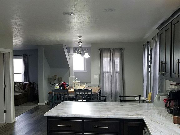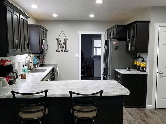 MOVE IN READY HOME IN A GREAT LOCATION OF TOWN ! This home has had a wonderful extensive remodeling job done to it and is one to see. The main floor consists of front porch/laundry, open kitchen and dining room, full bathroom, living room and bedroom.New kitchen appliances stay with the home , stove, dishwasher, microwave, garbage disposal, refrigerator. Upstairs has 2 bedrooms and full bathroom and storage room . Remodel consisted of new window, insulation, flooring, walls, wiring, plumbing, kitchen cupboards, counter tops, under mount sink and fixtures, paint and much more. The home is located on a corner lot and has a detached 2 car garage with new vinyl siding.