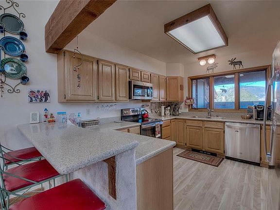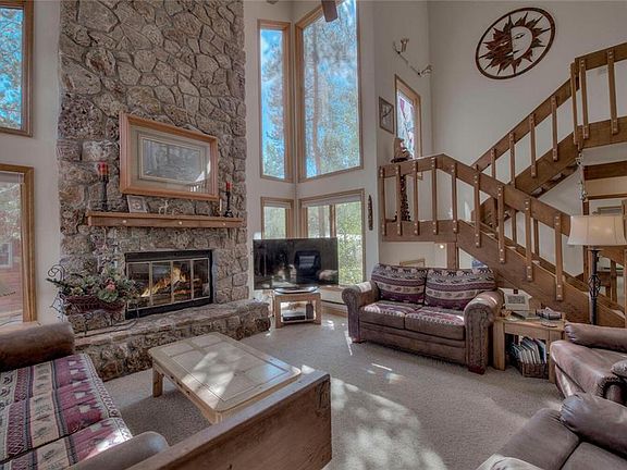 Continental Divide & (peek-a-boo) lake views from the large, covered front deck of this 3 BD + loft, 3.5 BA half duplex in Wildernest! Great floorplan on three levels with floor to ceiling rock surround fireplace in living room, vaulted ceilings & main floor master suite with private deck. Vinyl wood look floors & SS appliances in kitchen. Family/rec room downstairs with wood flooring. Plenty of storage and two car attached garage. NO HOA!