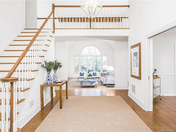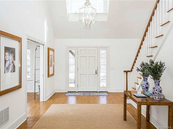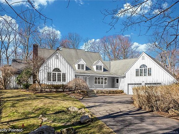 Rare opportunity to live on Oenoke Lane right across from the Oenoke Green Trail nature preserve and a superb location, just a stroll from town and train yet private and serene. This 5400 SF 4 bed/3.2 bath home has a fabulous flow for easy living and the vaulted rooms offer light and a glorious view to the lovely 1 acre manicured yard with pool. The 24 ft breathtaking Great Room boasts cathedral ceilings and fireplace and opens to the gracious foyer and delightful solarium. A 28ft kitchen is a cooks dream with island, wet bar, built in desks, pantry and more. The Library with gas fireplace and vaulted ceiling can be part of the main floor Master Suite that includes two walk in closets, dressing room and huge bath. There is a second full master suite upstairs along with two more guest rooms and bath. The enormous bonus room over the garage is a short flight up from the large mudroom with pool bath and laundry room and connects to the second floor bedrooms. The wraparound decks and porches make entertaining a breeze. A full walk out basement offers endless potential.