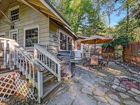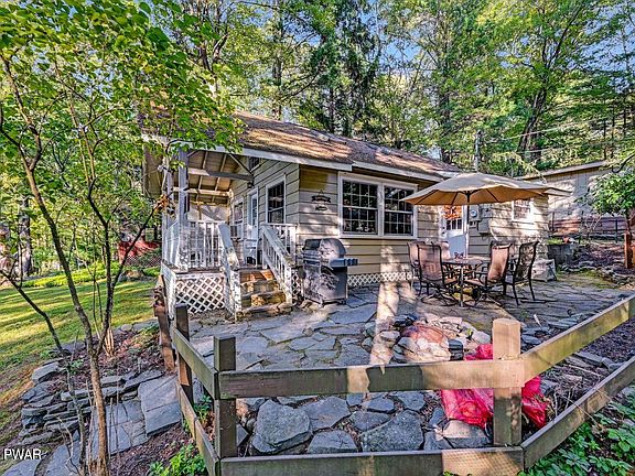 Gumble Cottage, steps from Lake Wallenpaupack & beautiful sunsets on the deck! This home has affectionately been named ''Pine Knoll'' & was the first home built in Lynndale. It features year-round living w/ 2 bedrooms, 1 bath and a sleeping loft - set on a double lot. The main level features a living/dining room with cathedral T&G ceilings, stone faced propane fireplace, kitchen, two bedrooms, a full bath, and laundry. The upper-level loft adds additional living or sleeping space. Enjoy breathtaking sunsets from the covered front porch or gather with family and friends on the spacious patio. Enjoy beautiful foliage in the fall & lake views! 2 car garage for additional parking & storage. Close to Hawley, many restaurants, entertainment, activities, shopping, and more. Turnkey, furniture included and just steps to the Lynndale beach area on Lake Wallenpaupack.