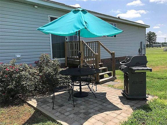 Spacious 5 BR 2 BA split floor plan Modular home conveniently located less than a mile over the VA/NC line for easy commute (less than an hour) to Hampton Roads, Eliz City and Ahoskie on 1.25 acres. The Large 5th BR with a fireplace could be family/game room, or easily add another bathroom for a true inlaw suite. Plumbing from a former wet bar in this room is already in place and capped off under the house . 2 sheds for plenty of storage, a 12X24 shed with its own sub panel and an 8X8 Rubbermaid. Many upgrades and all of the following are new within last 3 years-HVAC, water heater, refrigerator, dishwasher, floors, paint, light fixtures, patio, blinds, a number of trees, bushes & flower beds. Come on down, enjoy the peaceful country life and enjoy lower taxes. Drive a litte, Save alot!
