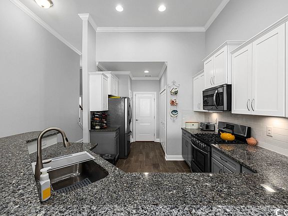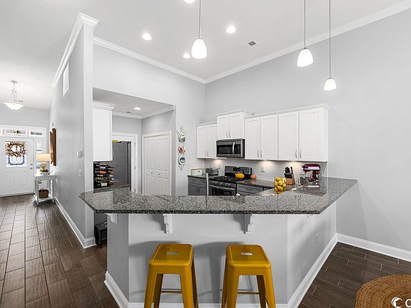 Stunning townhouse in desirable Murrells Inlet neighborhood of Parmelee townhomes! There is a lot to talk about this fabulous home with many upgrades! You enter through the foyer which is quite big. To the right is the front bedroom/office with a built-in custom Murphy bed and upgraded Berber carpet. There is also the 1st bathroom with custom tile and a glass door shower. One thing you notice as you walk through this home you notice all the natural light that comes in through the many windows throughout. The living area has tile hardwood-style flooring and carpet in all the bedrooms, stairway, and upstairs hallway. There is crown molding throughout most of the first floor. The kitchen is just gorgeous with granite countertops, tile backsplash, and tuxedo (2-tone) cabinets with under-cabinet lighting. The cabinets and drawers feature soft close. The drawers have full extension glides, and the base cabinets have double rollouts. The appliances are stainless steel, which includes a natural gas range. The pantry has full-depth shelving with lighting. The laundry area has a tile backsplash wall and cabinets for extra storage. The washer and dryer do convey with sale. The Great room which includes a dining area has vaulted ceilings and a wall of windows to view the backyard. Off to the left is the main bedroom which has tall ceilings and his and her closets. It does have private access to the Carolina room and outdoor patio. The Carolina room has tile flooring and has been enclosed with vinyl windows with screens which turns this into a Carolina room/screened-in porch. Upstairs is the 3rd and 4th bedroom, which has a side attic storage area and a unique section that can be a sitting area or office area. Both upstairs bedrooms share a Jack & Jill bathroom. Other things to note are that all the bedroom closets are quite large and walk-in. There is plenty of attic storage with a drop-down ladder from 2n floor. The backyard is one of the biggest in the development and has a large concrete patio to enjoy the outdoors. The 1-car garage has storage cabinets and a workbench area. This townhome electrical system has been upgraded with a built-in surge protector and 50-amp generator hook-up. This townhome is located close to the mailboxes and community pool. Parmelee Townhomes is a smaller development that has a great community clubhouse and pool. Do not miss out on a wonderful townhome that has been meticulously kept.