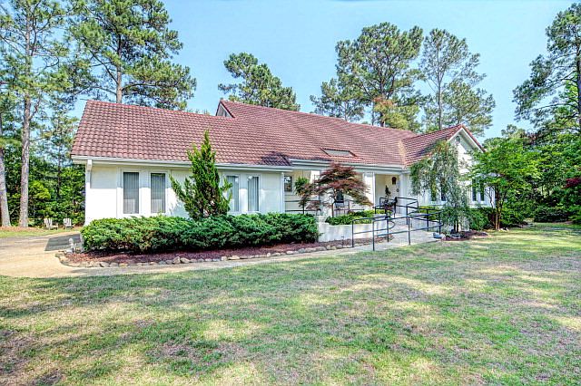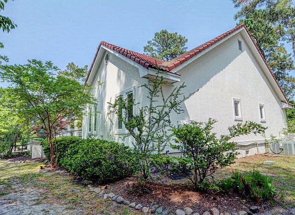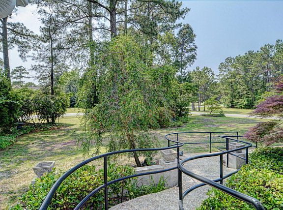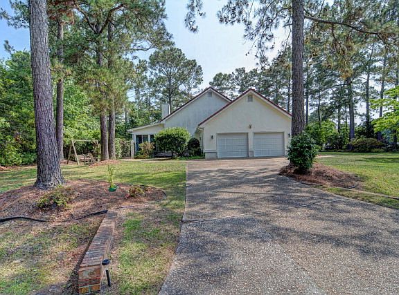 Situated on a large corner lot and secluded by mature trees, this lovely 3 BR, 2 BA home has a distinctive look with attractive curb appeal. Exterior features including a clay tile roof and hardie board siding are accented by beautiful landscaping and a well-maintained lawn. A meandering walkway leads up to the front entrance, with a large front porch ideal for outdoor relaxation. Stepping into the home, a spacious entryway opens up to a grand living room bathed in natural light with vaulted ceilings, rich hardwood floors and a stunning floor-ceiling stone fireplace. The large, airy kitchen offers custom storage and cabinets, pantry with sliding shelves, ample counter space, tile flooring, modern appliances including a double oven, plus a center island ideal for preparing meals with ease. This eat-in kitchen features a charming breakfast nook overlooking the lovely backyard, plus a convenient pass-through connecting to the living area. A formal dining room is accented by beautiful hardwood floors and large windows, ideal for entertaining on special occasions. Sliding glass doors open up to the spacious sun room, accented by blue slate flooring and surrounded by windows with panoramic views of the secluded backyard and patio. With a separate heating and air unit, this space is ideal for enjoying outdoor living year-round. The sizeable backyard patio further extends the outdoor living space, perfect for grilling out and spending time enjoying the expansive backyard within the privacy of this wooded lot. Bask in the sun when you want it or relax in the shade when you need it, the patio also features a retractable awning. Walkways leading to the backyard and front entrance of the home are easily accessible from the driveway, next to the sizeable two car garage offering additional storage units. This casually elegant home is located one block away from a community pool offering seasonal membership, just minutes from Topsail Island beaches and the city of Wilmington.