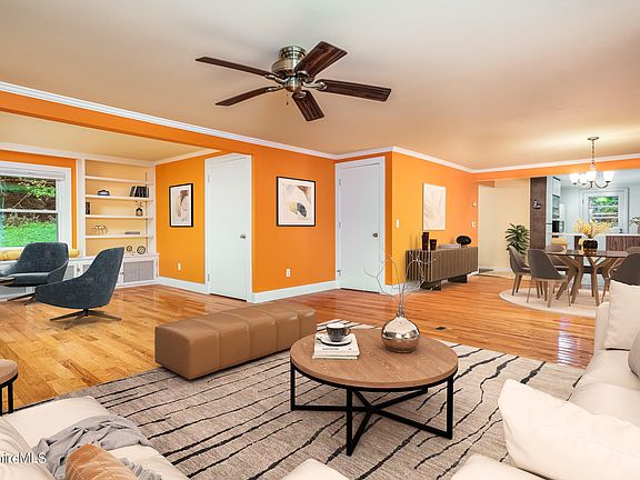 - Description: picture window, wood floor, fireplace, ceiling fan