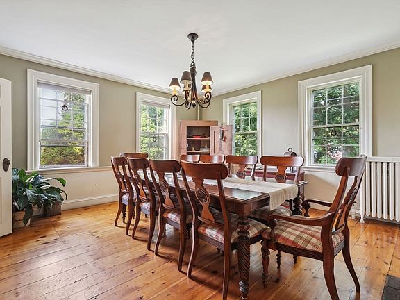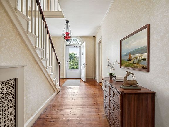 The John Hobart house, built in 1816, is a colonial home in the Federal style, set on over 1.96 acres of land. With approx. 3,900 square feet of versatile living space, hardwood floors, 6 fireplaces, a sleeping porch, spacious bedrooms, and flexible recreation, crafting, or home office areas. The ample windows fill the home with natural light. Connected to the house is a convenient two-car garage leading to a roomy mudroom, offering easy access to the comfortable living areas and an inviting outdoor patio. The house also includes a sunny family room, dining room, and a spacious entryway that opens to a large, sloping front yard. This property blends historic charm with modern convenience, making it an excellent space for living and hosting gatherings. Notable interior features comprise built-in bookcases, wainscoting, and crown molding. The private yard surrounds the home with perennials and fieldstone walls. Its location provides easy access to the town center and major routes.