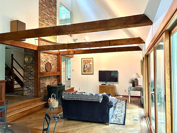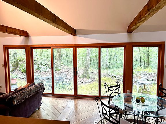 The epitome of where Contemporary Design, open spaces, light and efficiency meet the true warmth and pride of local master craftsman. If 9 secluded acres is not peace and privacy enough, your abutting neighbor is 128 acres of protected land owned by Flanders Nature Center. Live amongst the trees and fabulous backdrop of rock outcroppings. Some selective clearing could bring back distant mountain top views. Keep it local, keep it grounded...Bob Keating design, a local architect with a love of nature and minimal wall spaces. Guy Wolf designed, milled and laid all of the wide board oak, cherry and maple flooring. Woody Mosche crafted the bespoke Ash kitchen cabinetry and the cherry wet bar in the sunken great room. The great room focal points are the 26' exposed brick chimney against the soaring beamed ceiling as well as the sliders and numerous windows that bring nature inside. Two bedrooms on the main level and a wonderful primary suite encompasses the entire second level, complete w reading/office loft. The hiking trails that pass the three seasonal ponds have since faded and nature is just waiting for new curators to explore. Nine private acres gives you the potential to expand the existing home, or build another on the property for a family compound. The home calls to people who want a total seclusion from the world yet only a five minute drive into historic Woodbury with all its history, arts, charm and fabulous restaurants. Windows were all replaced by Anderson with an additional 12 years left on the warranty. A garage site has been leveled and previously approved. Central A/C does not work. Duct work is there, but new compressor is needed. The town has the property recorded as 7.33 acres, A2 survey shows 9.33 - owners working w the town on discrepancy. Owner purchased and additional .0524 acre triangle at drive entry to add 50' to road frontage. Map uploaded also.