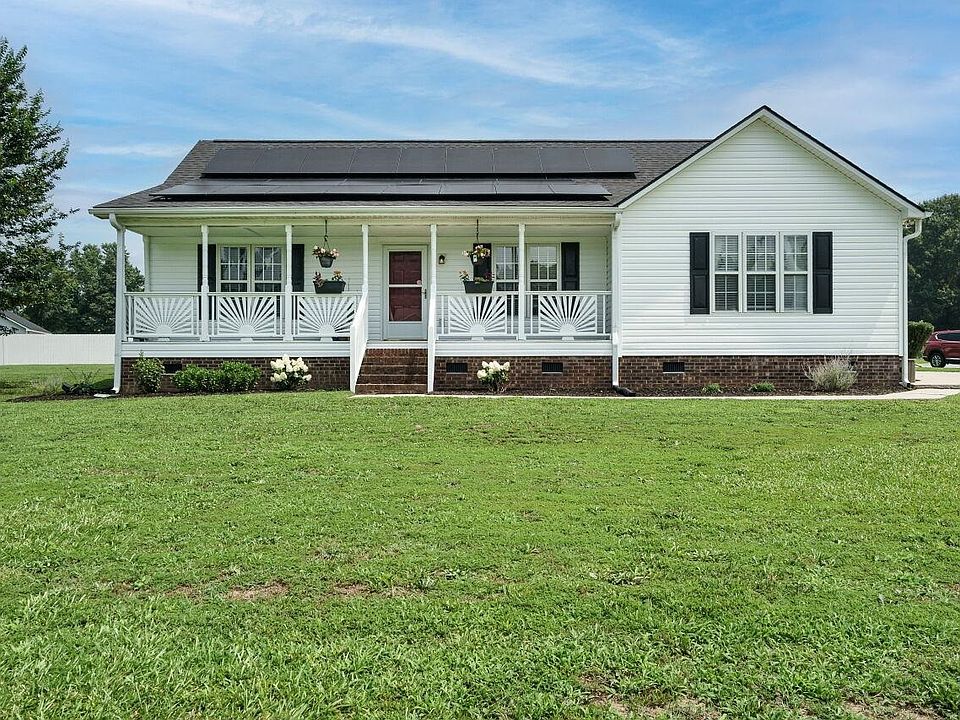 No HOA & No Restrictive Covenants In Phase 1 Of Subdivision! Do What You Want! Chickens, Goats, Pool, RV, Boat, Accessory Dwelling Unit On This 3/4 Acre Lot!!! 100% USDA Financing Available! Spacious Ranch w 3 Bedroom, 2 Bath, Formal Dining Room or Another Siting Area PLUS Office, HUGE Pantry/Storage Closet! New Roof 2023! New Solar Panels 2023 Keeps Electric Bill Near $20 Per Month! New Vinyl Siding! 2022 Refrigerator, Washer, Dryer Convey! Wide Plank LVP Flooring Throughout Home! No Carpet! Oversized Primary Bedroom w/ 2 Walk In Closets (1 Custom), New Dual Vanity, GardenTub/Shower Combo! Popcorn Ceilings Removed Majority Of Home w/ Added Crown Molding! Rocking Chair Front Porch, Partially Fenced Back Yard, 2 Sheds! HUGE Deck For Grilling & Watching The Sun Set! Close To Hwy 70 Bypass For Quick Trip To Raleigh! Zero Turn Mower w/ Clelaned Carburator, Oil Change & New Wheels For Sale $1500.