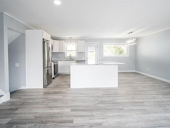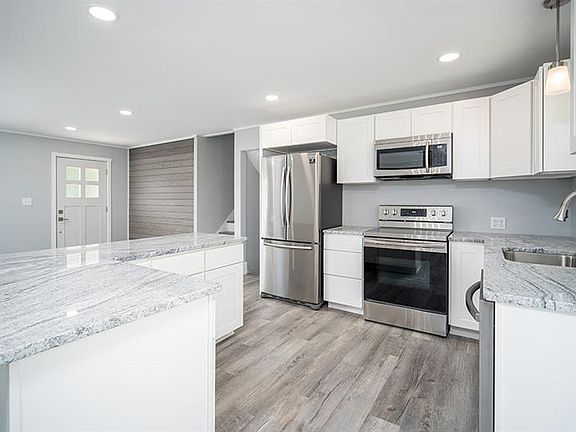 Turn key ready home. This 3 bed 2.5 bath home is ready for home owners. New roof, new siding! Tons of natural light shines through the main level of the house where you find a living rm, dining rm and brand new kitchen! Kitchen offers large island, white shaker cabinets, granite counter tops, stainless steel appliances and recess lighting. A few stairs take you to the upper level where you find 3 bedrms all with new paint and carpet as well as two brand new full bathrooms. En suite in master, showcases a beautiful subway tiled shower! Lower level provides a large game room with recess lighting and premium vinyl flooring. Second area with a dining/living space, plus a second kitchen area with large island and additional amenities! Ideal lower level to host events! The basement offers laundry and storage space. Backyard provides covered patio with surrounding flat area, as well as steps that lead you to upper yard. Brand new from porch and off street parking complete this amazing home!