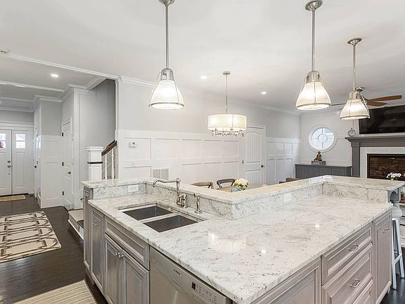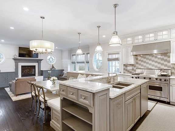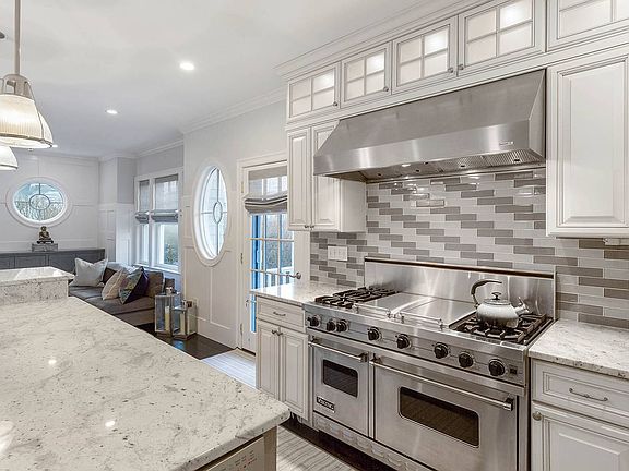 Chic Nantucket Style Colonial in the heart of the beach area, steps to beaches, school & one mile to town & train. Octagonal lighted cupola, 3 balconies, soaring 9' ceilings, lavish mill work, artistic built-in shelving & bookcases, circular windows, & dramatic light fixtures adorn this lovely home. Stunning Dining Room & Living Room are separated by custom half-wall with pillars & built in bookcases. Well-appointed chef's kitchen with L-shaped island, Viking gas range, breakfast bar & built-in dining area open to Great Room w/ gas fireplace & beautiful flanking custom cabinetry. On the 2nd floor are four large, well-proportioned bedrooms including exquisite Master Bedroom with sculpted walls, circular windows with rich trims, & generous double walk-in closets. Pamper yourself in the Master Bath with double sinks, luxurious soaking tub & large marble shower. Delightful Guest BR is en suite w/ generous double closet. Pass through the extra wide hallway adorned w/ custom storage cabinetry and tufted reading nook to Bedrooms 3 and 4 which share a lovely hallway Full Bath. Continue on to the third floor to the versatile Recreation Room with a separate office area. Walk out onto the south-facing circular balcony & take in the tempting water views. Outside you'll find a private, fenced back yard w/ vast blue stone patio w/ gas fireplace & built in BBQ- perfect for sunbathing, dining al fresco or just gathering around a roaring fire. This is coastal chic living at its finest.