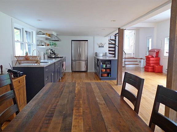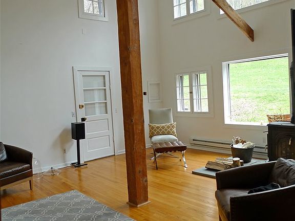 Country loft living on 5.74 acres in a lovely and peaceful rural setting. This unique barn conversion offers open space, light and windows galore, with some high end, well chosen features: A sleek gourmet kitchen complete with Bertazzoni range and super functional cabinetry from a well known local custom producer, beautifully done bathrooms with lovely fixtures. Vintage floors upstairs, numerous french-style casement windows, spiral stairs, nooks and crannies all add charm, quirkiness and warmth. Flexible layout with room for everyone. Great screened porch and stone patio ensure plenty of ways to enjoy the outdoors. Two sizable outbuildings in need of work could become great studio or workshop space.