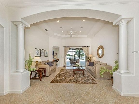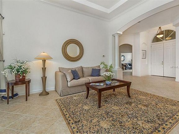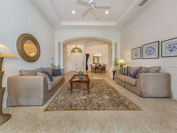 Tour #1-Walk through this home on your computer in 3D. You'll see the peaceful lake beyond the pool area. A formal living room, with lake views, and a dining room dominate the central core of the home. This immaculate Da Forli Model accommodates 3 bedrooms, 3 baths and a den-- a possible 4th bedroom, if desired. Master suite features a tray ceiling & sliders to lanai with windows affording lake views. Dual sinks, garden tub and shower in master bath. Separate wing features 2 guest bedrooms, separated by a bath. The open floor plan is a Kitchen/Family Room Combination with a breakfast area. The upgraded kitchen features expansive granite counters and dark wood cabinets with crown molding. New appliances, including a gas range, were added in 2015. New lanai screening as well as a pool heater, also added. Many fine upgrades include: 18"tile on diagonal, crown molding, volume ceilings;surround sound,open floor plan with gorgeous lanai, over-sized garage and paver drive. Siting is such that