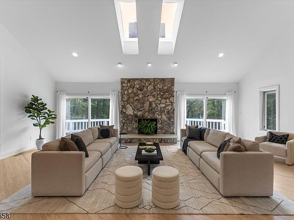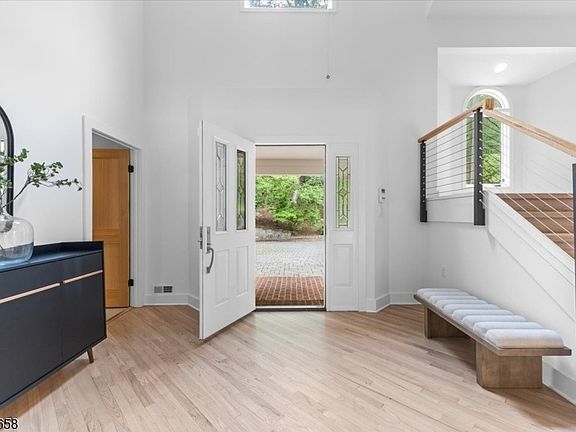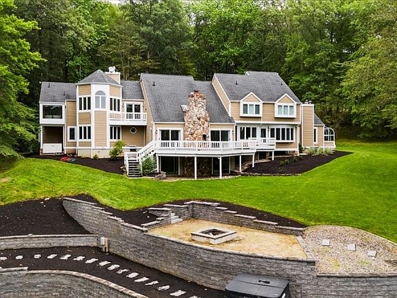 Modern masterpiece located on private 5 acre lot! Enter into a 2-story foyer leading to a skylit great room with FP open to a generously sized formal dining room. A 1st floor bedroom with bath offers a versatile space, work from home in a first floor office and enjoy the spacious kitchen with adjoining family room and solarium. The 2nd floor primary suite features a fireplace, cathedral ceiling, deck, fireplace, 16 x16 sitting room, two immense walk-in closets and a stunning nearly new spa like bath. Three additional bedrooms, two newer baths(1 ensuite) and an airy loft complete the second floor. More space is found in the finished walkout with large rec room, kitchenette, newer full bath, music room, craft room and storage. 3- car garage with Tesla charger. Yard offers firepit area,gazebo, and basketball court. Superb location on a cul-de- street not far from center of town, shopping, NYC trains and highways.