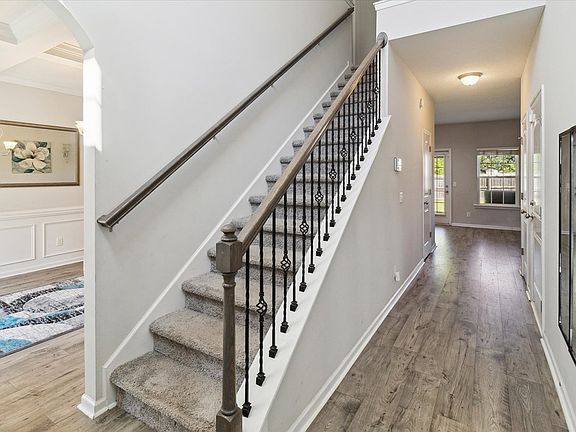 Welcome to Tranquil South, one of Flemington's newly established neighborhoods. This home is conveniently located on a corner lot at one of the neighborhood entrances and is close in proximity to multiple Ft. Stewart gates and all Hinesville and Flemington have to offer. Upon entry, this home features luxury vinyl plank flooring, a two story foyer, and a formal dining room with a bay window, wainscoting, and a coffered ceiling. The Sunbury floor plan by RTS Homes is open concept, as there's a clear view from the family room into the breakfast area and kitchen. The kitchen features espresso shaker cabinetry with brushed nickel hardware, granite countertops, ceramic tiled backsplash, and stainless steel appliances. The kitchen also has a pantry and there's also a downstairs half bathroom and laundry room. Upstairs includes three guest bedrooms with spacious closet space, linen closet, a full bathroom, and the primary suite. The primary suite has high ceilings with tons of natural light as well as a separate seating area and a bathroom with dual vanities, a separate shower, large garden rub, water closet, and a large walk in closet. Outside, the backyard is privacy fenced with a covered patio. Schedule your showing today!