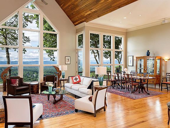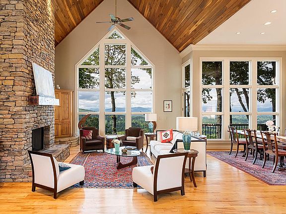 Exquisitely Renovated! Stunning home w/ expansive long range views of golf course, city of Hville and Blue Ridge mtns. Northern facing panoramic views from every room. Located on quiet cul-de-sac in the gated Kenmure Country Club community w/gorgeous landscaping and outside lighting to accent home. Main level features open floor plan, cathedral walnut paneled ceiling, floor to ceiling stone fireplace, custom walnut front door, maple wood floors, wall of windows, dining area, master suite w/ cathedral ceiling, private deck, shower w/ steam feature, whirlpool, expansive kitchen & breakfast area w/gas fireplace,high-end SS appliances, granite counters, island,custom walnut cabinetry and study. Amazing LL boasts family rm w/ wood burning stove, bar area, 2nd master suite, guest BR/full BA, office and large hobby/bonus rm. Relax while taking in the majestic views from the screened porch, multi-level deck or soaking in the hot tub. 2 car plus golf cart garage. Level entry! Luxury Mtn Living.