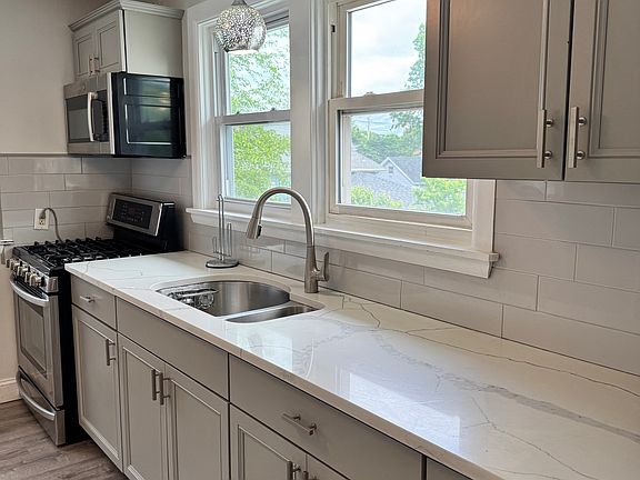 Renovated second floor three bedroom with private entrance in Providence near Pontiac and Reservoir Ave on Cranston city line. Located just 1.4 miles or 5 minutes to Roger Williams Park, 3 miles or 8 minutes to Garden City shopping in Cranston, and 5.4 miles or 9 minutes to Rhode Island Hospital. This apartment is sunny and offers large living room, dining room, three bedrooms, one bathroom, and large eat in kitchen. Quartz countertops in kitchen, large double door refrigerator, gas stove, microwave, island countertop and stainless steel appliances. One off street parking spot in driveway. Shared backyard. Coin operated laundry in basement. No smoking. No pets. Good credit score, income, clean background, and references required. Tenants pay gas, electric, and internet. Owner pays water and sewer. Available now. Renter's insurance required. 12 month lease term.