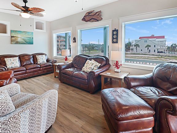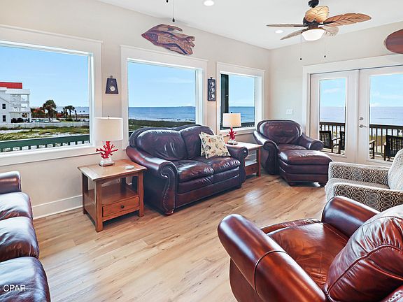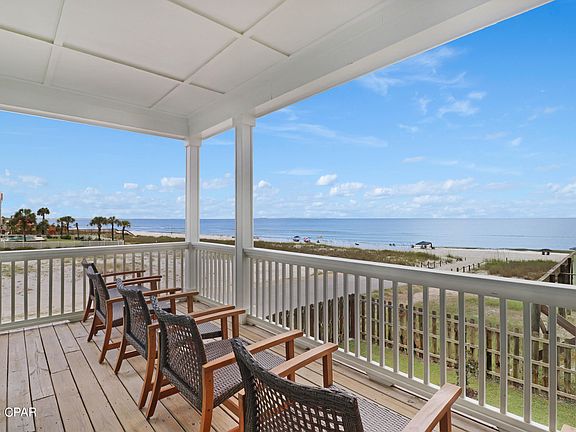 If you've been dreaming of paradise, look no further. This 1st tier 3-bedroom, 2-bathroom home offers unobstructed Gulf views that will take your breath away. Located just steps from the pristine sandy beaches, this open-concept coastal retreat is designed for those who crave both luxury and natural beauty. From the moment you step inside, you'll be greeted by the soothing sight of the Gulf. This home is a testament to the ''view, views, and more views'' that you desire in beachfront property. The interior is thoughtfully designed with vinyl flooring throughout and adorned with granite countertops featuring an attractive tile backsplash. The master bedroom boasts a coffered ceiling, adding a touch of elegance. The custom walk-in shower and separate garden tub in the master bathroom provide the perfect spa-like escape. Step outside, and you'll discover an outdoor shower for washing off the salt and sand, as well as ample storage for your beach gear. The patio furniture invites you to relax and soak in the sun. A fenced-in yard ensures privacy and a safe space for family and pets to play. Wake up to the sound of the waves, enjoy endless beach days, and savor sunsets that will leave you speechless.