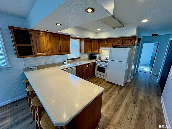 This home has it all. Beautiful three bedroom with potential for four, 1.5 bath ranch home! Living room in the front of the home and family room in the back with gorgeous brick gas fireplace. Open concept family, dining, kitchen area. Luxury vinyl plank throughout. Third living room space could be used as fourth bed-it does have a closet. Kitchen appliances stay as well as the washer and dryer. Nice two car attached garage. Concrete drive. Concrete patio. Large 100 x 150 lot. Detached 24 x 32ft. garage with two garage doors, heated. Don't miss out!