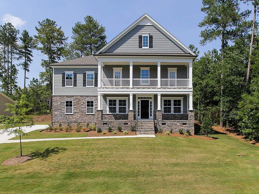 Marlette F floor plan w/double porch! Very popular floor plan featuring a gourmet kitchen w/SS appliances, gas cooktop, granite counters in kitchen & master bath, hardwoods, tile bath flooring, study w/French doors, screen porch and deck. Fabulous entry w/double foyer w/iron rails. Huge game room w/double doors and a his and her master closet.