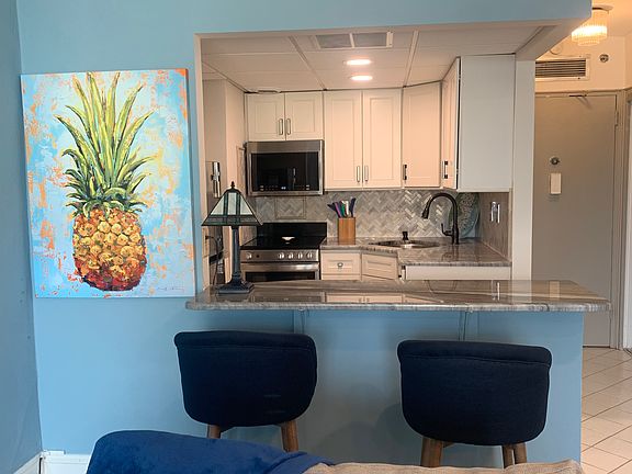 1 bedroom 1 bath waterfront oasis has newly renovated kitchen with granite countertops, updated bathroom fixtures. New flooring in living and bedroom. Ocean front views from living and bedroom. Large bedroom with walk in closet. Laundry, and fitness onsite. Utilities included. June July and August 2025