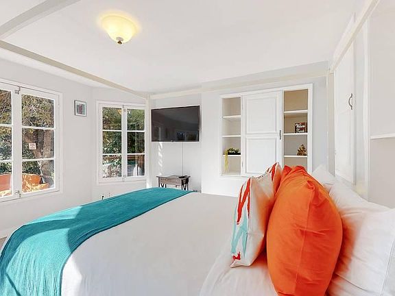 Vibrantly decorated Brentwood Park home awaits your perfect escape. Newly furnished and modern, with 3 bedrooms, plus den with a pullout queen sofa and 3 full baths. Private Master and Den are upstairs, two bedrooms are located down the spiral staircase. The kitchen is filled with an abundance of appliances, making it a chef's dream. The house opens up to outdoor decks for relaxing and sipping cocktails while native deer, rabbits, hummingbirds, and butterflies dance in the sunset. The immaculate landscaping and grassy yard, along with the pool are perfect for summer fun or simply relax in the secluded jetted hot tub. This newly remodeled home is peaceful, with spectacular views of the mountains all while hidden away in a prestigious neighborhood. Sunny over 300 days a year, even when the coast is fogged in. Picturesque hiking trails in the Santa Monica Mountains are only a short walk away along with fantastic eateries. OUR COMMITMENT TO GUESTS IS 'ROCK' SOLID: Safety is our #1 concern! Highly trained cleaning crew strictly don protective gear, including NIOSH approved face masks while cleaning the entire home and follow all cleaning and disinfecting best practices to ensure your safety. Only EPA approved List N: Disinfectants for use against SARS-CoV-2 (COVID-19) are used. This process includes the entire home being fogged with hospital grade Clorox Hydrogen Peroxide in addition to all high touch areas being scrubbed. All linens and towels are removed, sanitized, and professionally laundered between guest arrivals. The home has limited "soft surfaces" i.e. no carpeted floors. Equipped with a centralized hospital grade HEPA filter which are at least 99.97% efficient at filtering 0.3 m (microns). Hand sanitizer dispensers containing 80% alcohol (Made in USA) have been installed at the front door. Main entry door will be sealed with a dated tamper proof seal after inspected by 3rd party. Additionally, all guests are provided antibacterial cleaners for their personal use.