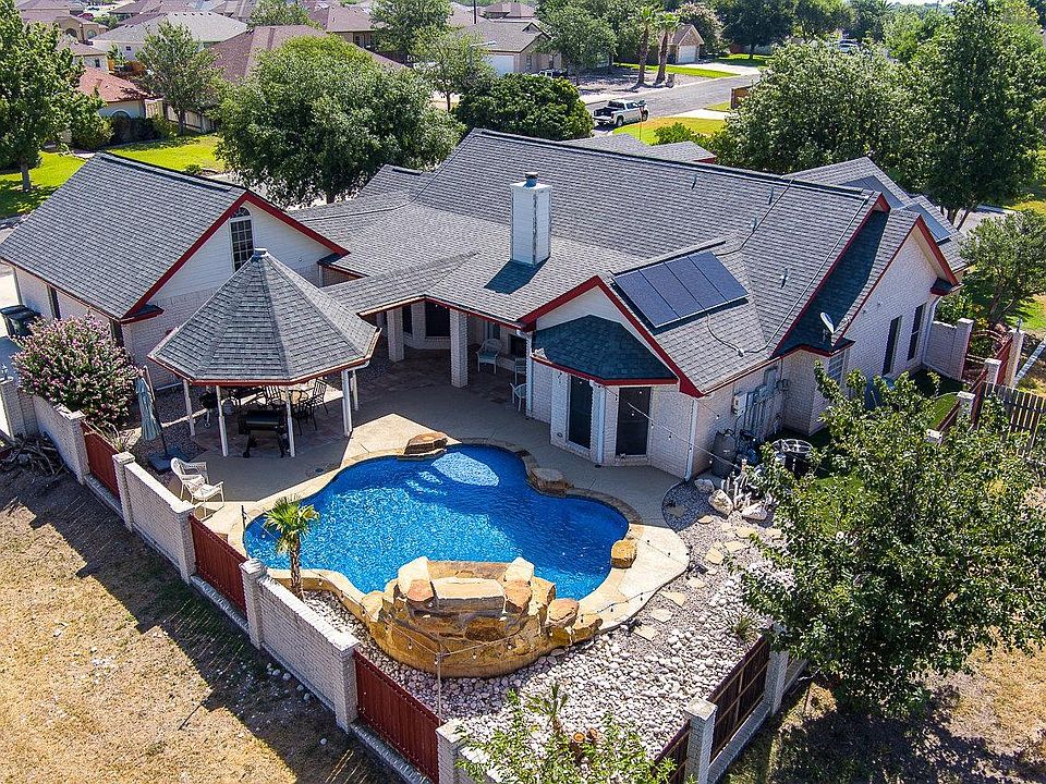 K Zar's Pool, heated, amazing rock waterfall, gazebo and outdoor fireplace for the ambience. Over 39 solar panels, helping with those electric bills, plantation shutters and solar screens. Corner lot, half/circle drive, side garage entry, RV parking, spectacular landscaping includes a full sprinkler system, partial wrap around covered porch. Please click to view the video for more details. Cooks dream kitchen with eat in bar overlooking the grand family room and breakfast nook. Wood and tile floors, 4 bedrooms, 2 1/12 bath, 4th bedroom could be used as an office. Make an appointment for viewing -- Please allow at least 2 hours' notice for viewing.