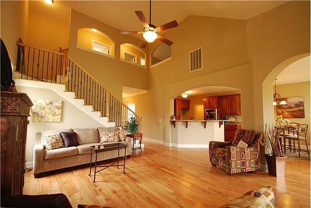 The Williamsburg. Contemporary open plan with 2 bedrooms down and 2 up. Red Oak Hardwoods,Granite counters, stainless appliances. arched doorways, rounded corners, tile in baths and laundry are all standard. No upgrades needed. www.creeksidenewhomes.com